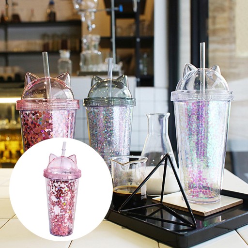 CEKINOWY KUBEK SŁOMKOWY: Pokrywka kubka w kształcie , korpus kubka jest inkrustowany cekinami i jest wyposażony w słomkę, wygląda bardzo stylowo.