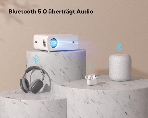 - Połączenie Bluetooth i stereo Hi-Fi - przenośny mini projektor jest wyposażony w zintegrowany system Bluetooth 5.2, za pomocą którego można bezprzewodowo połączyć głośniki Bluetooth lub słuchawki Bluetooth (Bluetooth nie może przesyłać filmów / zdjęć). Ponadto oba głośniki stereo 5 W, które są zintegrowane z systemem dźwiękowym SRS, zapewniają doskonały dźwięk stereo HiFi.