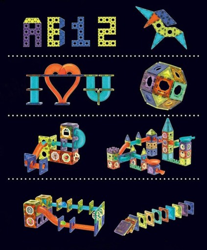 Klocki charakteryzują się łatwością łączenia poszczególnych elementów w dowolny sposób oraz pod różnymi kątami. Na bokach każdej figurki są wbudowane mocne magnesy neodymowe, którą z dużą siłą łączą ze sobą kolejne klocki tworząc przeróżne figury. Klocki można układać płasko tworząc tory, wężyki itp oraz przestrzennie budując przeróżne figury trójwymiarowe. W ten sposób dzieci będą mogły nie tylko pobudzać swoją wyobraźnię przestrzenną.