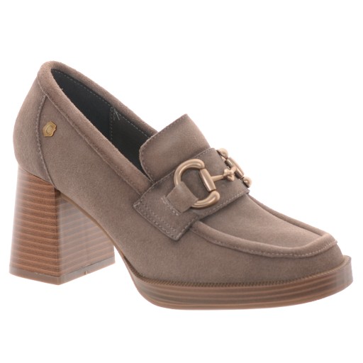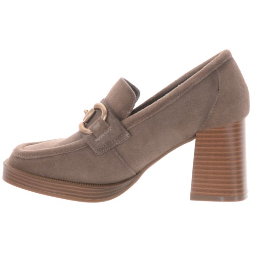 Te mokasyny na obcasie z pewnością przykuwają uwagę dzięki swojemu oryginalnemu złotemu elementowi ozdobnemu na noskach. To subtelnego blasku dodatek, który doda uroku Twoim codziennym stylizacjom.