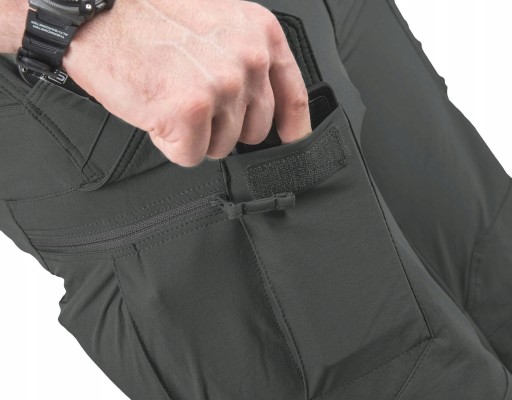 Odpowiednie rozplanowane kieszeni pozwala rozmieścić ekwipunek blisko środka ciężkości – wokół bioder i pasa. Krawędzie kieszeni przednich są dodatkowo wzmocnione, by wytrzymały intensywne wsuwanie klipsów od noży, czy latarek. 2 kieszonki na przodzie ud zapinane na rzep doskonale nadają się do przenoszenia smartfona ale są na tyle duże, że można umieścić w nich nawet magazynek AR/AK. Boczne kieszenie udowe zapinane na suwak na pierwszy rzut oka są płaskie, ale ich konstrukcja sprawia, że bez najmniejszego problemu można w nich przenosić większe przedmioty.