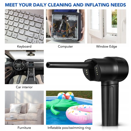 Ten produkt to wielofunkcyjny odpylacz na sprężone powietrze. Może zdmuchnąć kurz z powierzchni komputerów, klawiatur i zabawek, a także nadmuchać balony, kółka do pływania, nadmuchiwane łóżka itp. Nadaje się do czyszczenia gospodarstw domowych i czyszczenia wnętrza samochodu. Bezprzewodowa konstrukcja, łatwa w użyciu, łatwa w rozwiązywaniu różnych problemów związanych z czyszczeniem.