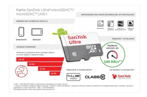 - SanDisk to uznany producent, dlatego karta pamięci jest niezawodna i bezpieczna w użytkowaniu.