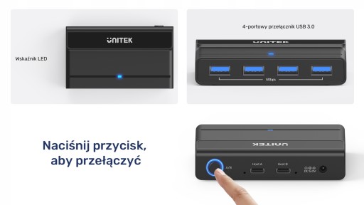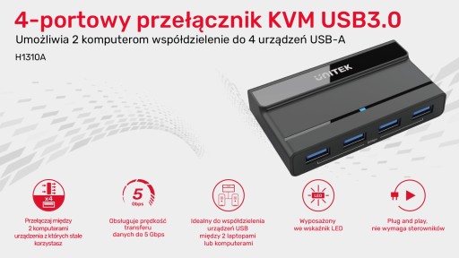 Przełącznik 4x USB 3.0 to urządzenie, którego nie powinno zabraknąć w żadnym nowoczesnym biurze – zarówno tym domowym, jak i firmowym. Przepinanie kabli jest irytującą czynnością, z którą w szczególności mają do czynienia osoby używające komputerów przenośnych i kursujące z nimi między biurem a domem czy szkołą. Jeżeli więc szukasz prezentu dla takiej osoby, to KVM USB Unitek jest przysłowiowym strzałem w dziesiątkę!