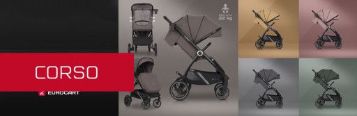 CORSO marki EURO CART to duży wózek spacerowy, który z pewnością wystarczy do końca wózkowania. Maksymalna nośność wózka wynosi aż 26,5 kilograma! Składa się na nią maksymalna waga dziecka do 22 kg, obciążenie koszyka do 3 kg oraz opcjonalnej torby do 1,5 kg.