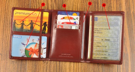 Zmieści 6 kart bankomatowych lub dokumentów tego formatu oraz dowód rejestracyjny, legitymację szkolną itp. Całość obrazują poniżej przedstawione zdjęcia.