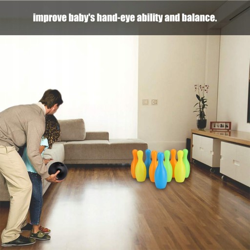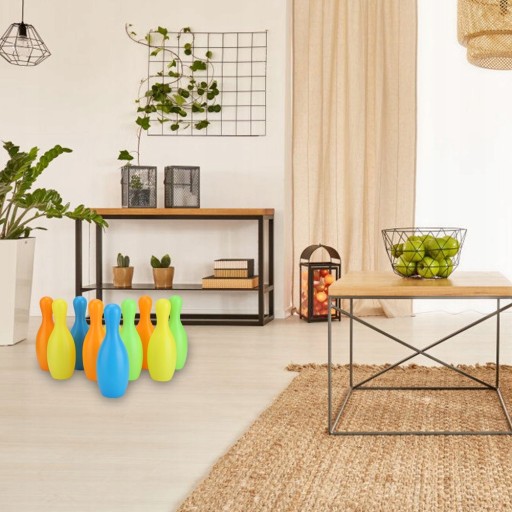 1. Jest to zestaw do gry w kręgle dla dzieci, który jest wykonany z wysokiej jakości tworzywa sztucznego ABS.