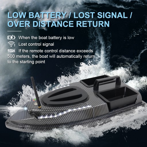 - Automatyczny powrót: odległość zdalnego sterowania wynosi 500 metrów. Kiedy łódź ma niski poziom naładowania baterii, traci sygnał lub przekracza 500 metrów, powróci automatycznie. Nie bój się przegranej.