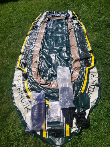 Ponton z serii Set charakteryzuje się także zwiększonymi wymiarami, które w tym wypadku wynoszą 351x145x48cm. Maksymalna wyporność wynosi 370kg co stanowi spory zapas dla nawet 4 rosłych mężczyzn. Przeznaczone do wędkowania pontony Seahawk charakteryzują się wykonaniem z winylu o zwiększonej grubości, który jest bardziej odporny na różnego rodzaju otarcia. W przypadku uszkodzenia pływających chroni system 3 komór. Każda z nich jest niezależna i brak powietrza nie powoduje zatonięcia pontonu.
