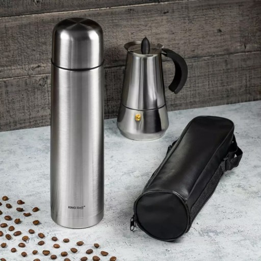 Termos stalowy z pokrowcem. Wykonany ze stali nierdzewnej. Termos posiada podwójne ścianki i jest odporny na wstrząsy. Posiada przycisk z funkcją nalewania. W zestawie pokrowiec w kolorze czarnym. Aby zawartość termosu utrzymywała ciepło lub zimno należy wstepnie podgrzać lub schłodzić termos przez 2-3 minuty, aby wymagana temperatura zawartości utrzymywała się na dłuższy czas. Po napełnieniu termosu nalezy zamknąć szczelnie pokrywę.