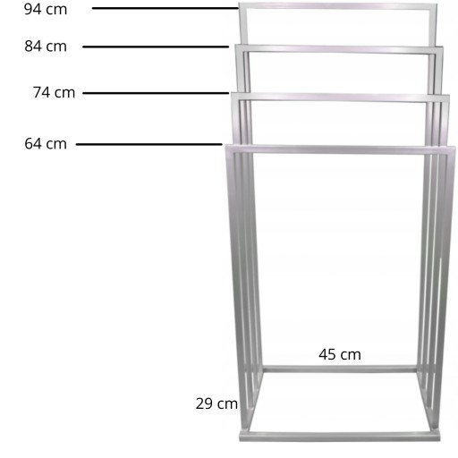Stojak posiada cztery ramiona umieszczone na różnych wysokościach, na których możesz zawiesić ręczniki o odmiennej długości. Przestrzenie między ramionami sprawiają, że ręczniki szybciej się suszą.