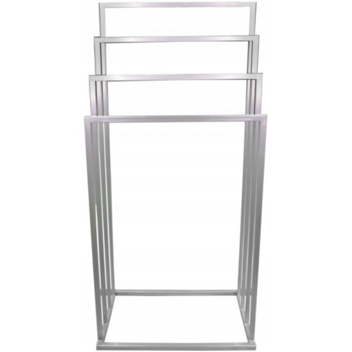 Prezentujemy piękny metalowy stojak na ręczniki w kolorze srebrnym. Wykonany jest ze stali malowanej proszkowo, dzięki czemu jest odporny na wilgoć.