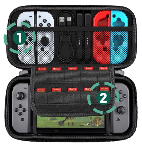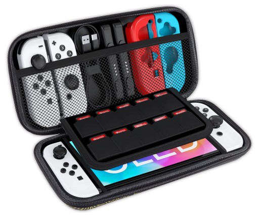 Etui jest idealnie dopasowane do Twojej konsoli Nintendo Switch i Nintendo Switch OLED - idealnie ją zabezpiecza. Wewnątrz posiada specjalne przegródki mieszczące aż 10 kartridży z grami. W górnej części futerału znajduje się specjalne miejsce na przechowywanie akcesoriów do konsoli takich jak ładowarka, powerbank, słuchawki, pudełka z gier, itd. Pokrowiec posiada także praktyczną smycz do przenoszenia.