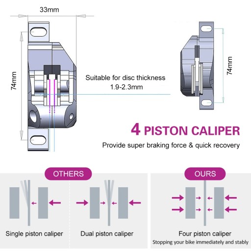 1️⃣Four piston calipers help you to stop your bike immediately and stably.