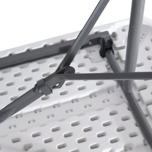 Stół składany jest stabilny i bezpieczny w użyciu. Posiada blokadę zapobiegającą samoistnemu złożeniu się stołu, co jest nieocenione podczas bankietów na świeżym powietrzu. Ponadto, nogi stołu wyposażone są w wsporniki z blokadą, a antypoślizgowe stopy zapewniają dodatkową stabilność, nawet na nierównych powierzchniach.