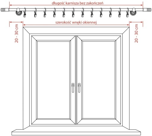 - przy karniszu podwójnym - 1 szt drążka fi na drugi bieg o długości 200 cm
