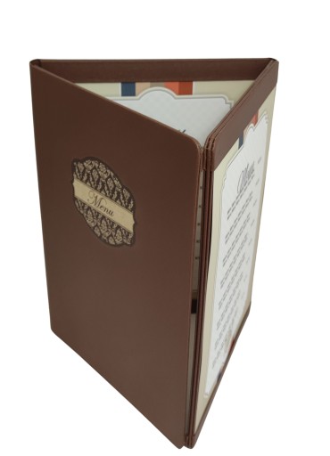 Wewnątrz karty możliwość mocowania własnych wydruków z daniami w standardowym formacie A4 ( 4 kartki jednostronnie wydrukowane) wkładając w zakładki ( paski z płótna góra dół)
