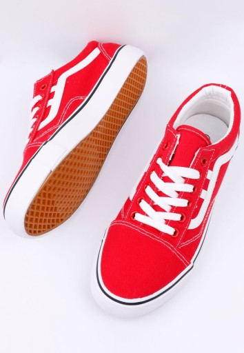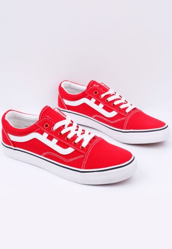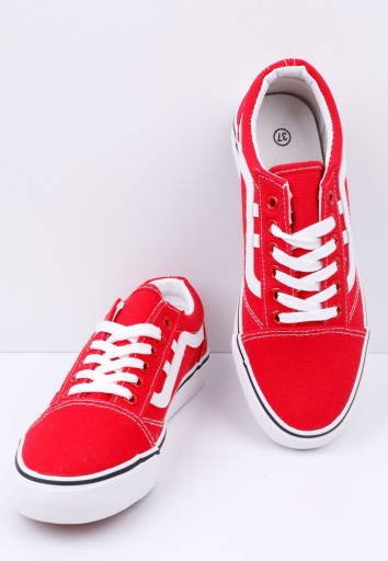 Trampki damskie ,na płaskiej podeszwie. Gładkie, nosek okrągły. Wiązane na płaskie sznurowadła. Wykonane z materiału tekstylnego. Udekorowane podłużną wstawką po bokach. Świtnie się prezentuja z prostymi jeansami.