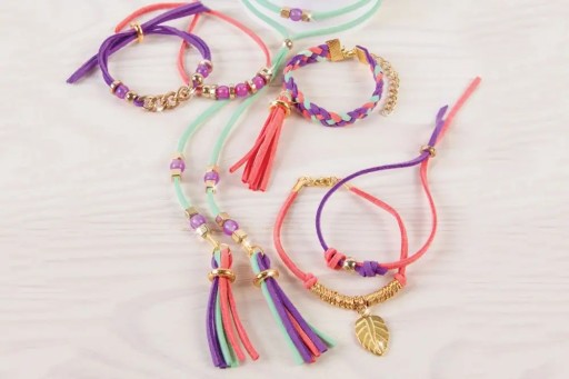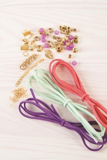 Ten niezwykły zestaw pozwoli początkującym projektantkom biżuterii poznać podstawowe techniki potrzebne do wykonania czterech stylowych bransoletek ze sztucznego zamszu oraz modnego chokera.