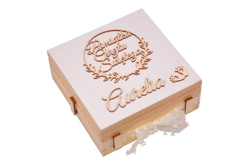 - na wieczku napis/wieniec ze sklejki ,,Pamiątka Chrztu Świętego'' wycinany wysokiej klasy laserem,
