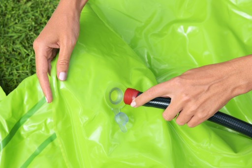 Po podłączeniu do węża ogrodowego z kapelusza rośliny zaczną pojawiać się strumienie wody, które będą delikatnie zraszać dzieci podczas gry w rzut obręczą.