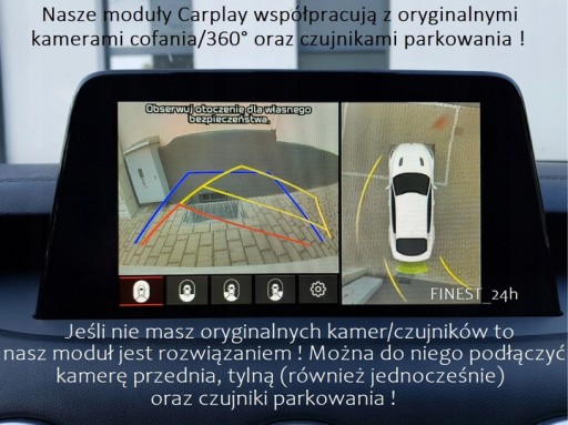 - Współpracuje z fabrycznymi kamerami cofania oraz czujnikami parkowania - również z kamerami 360° - obsługiwane są dynamiczne linie prowadzenia/linie skrętne !