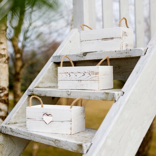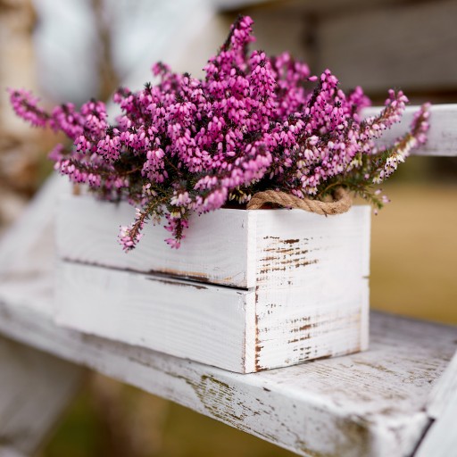 Skrzynka wykonana jest z suszonego drewna drzew iglastych poddanego specjalnej selekcji. Dodatkowo pomalowana na kolor biały z rustykalnymi przetarciami. Biały kolor fantastycznie podkreśli zieleń liści i kolory kwiatów.