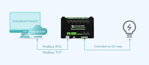 Obsługuje wysyłanie poleceń protokołu Modbus RTU/TCP za pośrednictwem portu Ethernet w celu sterowania przekaźnikami oraz różnymi urządzeniami.