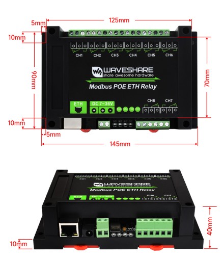 Dodatkowe informacje, sposób konfiguracji itp na stronie: https://www.waveshare.com/wiki/Modbus_POE_ETH_Relay
