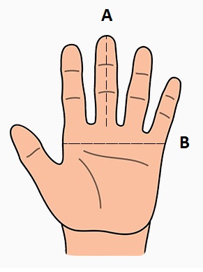 Zmierz długość swojego palca środkowego (wymiar A) oraz obwód ręki (wymiar B). Rękawiczki dostępne są w rozmiarach: