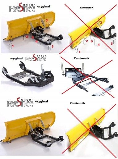 Z uwagi na dostępny na rynku tani zamiennik naszego pługa śnieżnego z przednim montażem , który wprowadza klientów w błąd przypominając wyglądem oryginalny produkt PRESTIGE postanowiliśmy się przyjrzeć bliżej temu zamiennikowi i wskazać istotne różnice między oryginałem a zamiennikiem, których na zdjęciu nie widać dobrze .Wszystkie te różnice wpływają na trwałość produktu oraz jego funkcjonalność