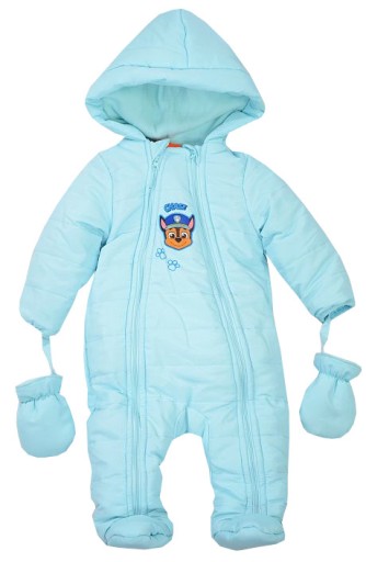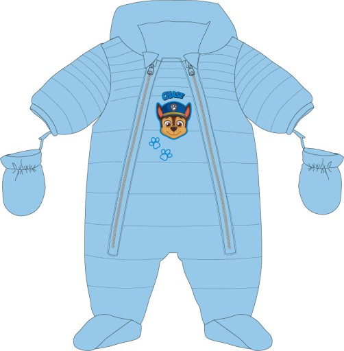 Krój: kombinezon, zasuwany na dwa, wygodne zamki zabezpieczone materiałem aby nie drażnić skóry dziecka. Kaptur ocieplany, do rękawków dopinane na zatrzask rękawiczki. Na przodzie nadruk pieska z bajki "Psi Patrol".