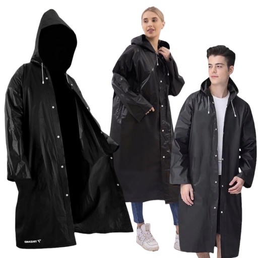 Płaszcz przeciwdeszczowy jest bardzo długi, a dodatkowo posiada jeszcze kaptur, który na końcu ma sznureczki. Idealna ochrona przed deszczem. Kaptur ze sznureczkami, który chroni głowę i włosy przed deszczem.