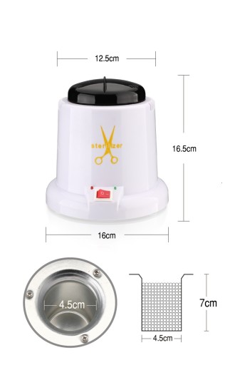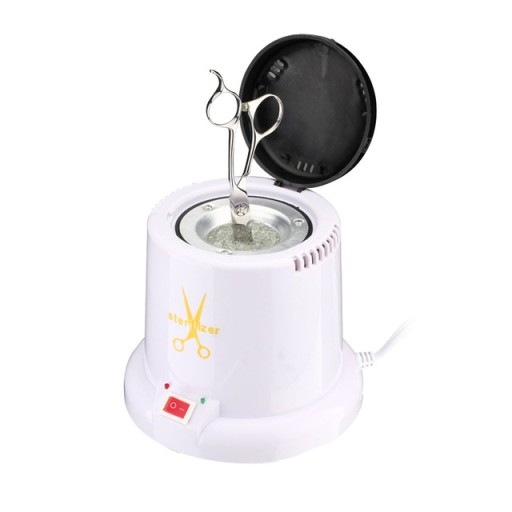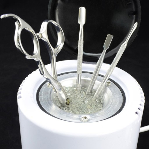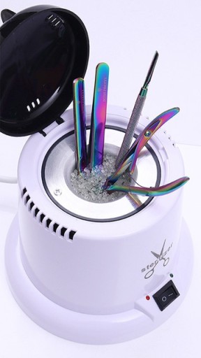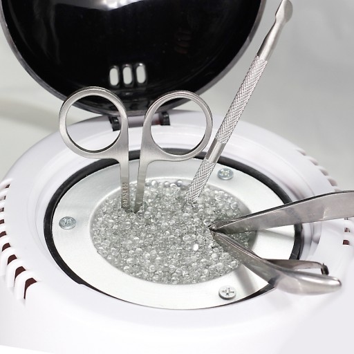 Profesjonalne urządzenie do sterylizacji metalowych narzędzi (np. cążki, nożyczki, pęsety oraz inne), zawierające szklane kulki.