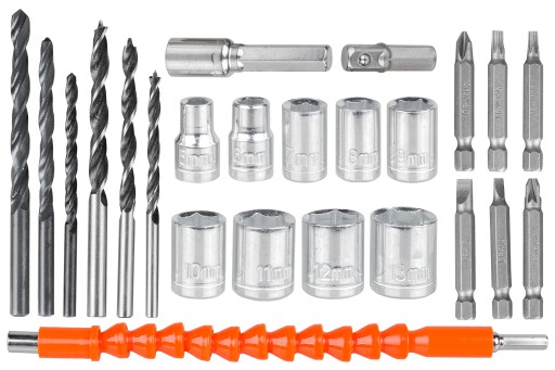 Zastosowana głowica samozaciskowa pozwala na szybki montaż wierteł i bitów od 0,8mm aż do 10mm. Natomiast dołączona do zestawu przedłużka pozwoli na pracę w ciasnych i trudno dostępnych miejscach.