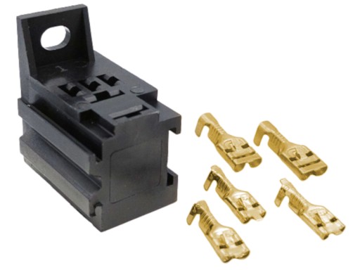 Gniazdo wykonane z tworzywa. Posiada ucho z owalnym otworem (wymiary 5mm x 6mm) pozwalające na pewne zamontowanie gniazda przekaźnika do karoserii lub innego stabilnego elementu pojazdu lub maszyny. Dzięki wypustom na bokach gniazda można je łączyć w większe zestawy (moduły). W komplecie 5 konektorów nieizolowanych (2 na szersze piny oraz 3 na węższe) do samodzielnego montażu na przewodach (brak w zestawie).