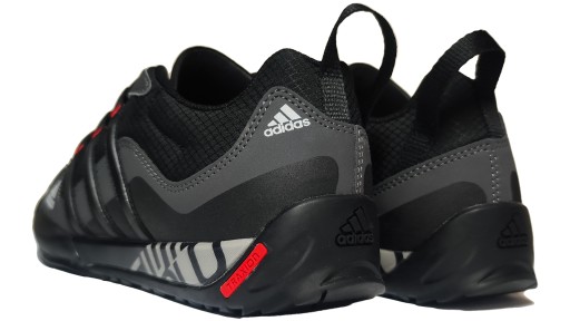 Buty sportowe Adidas Terrex Swift Solo. Świetne buty przeznaczone zarówno do użytku codziennego jak i do uprawiania różnego rodzaju sportów. Podeszwa z systemem TRAXION gwarantuje bardzo dobrą przyczepność do różnorodnego terenu. Obuwie bardzo dobrze dopasowuje się do stopy. Kolory czerń i szarości, czerwone wstawki.