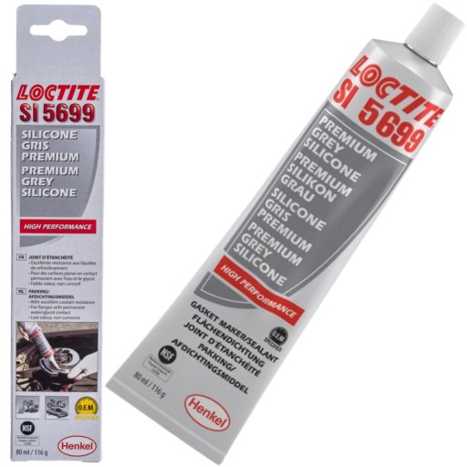 LOCTITE SI 5699 GY - jest elastycznym silikonowym uszczelniaczem, który utwardza się pod wpływem wilgoci w powietrzu i tworzy w rezultacie mocne uszczelnienie kauczukowe. Produkt jest przeznaczony głównie do tworzenia uszczelnień złączy kołnierzowych z doskonałą odpornością na olej lub uszczelniania sztywnych złączy kołnierzowych, np. między przekładniami i obudowami metalowymi. Środek traci lepkość po zaledwie 10 minutach i jest odporny na wodę i glikol. Można go używać na obrobionych lub odlewanych powierzchniach, metalowych lub wykonanych z tworzywa.