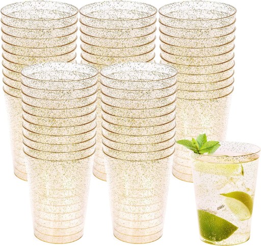 Złoty brokatowy detal nadaje tym kubkom wyjątkowego uroku. To idealny dodatek, by nadać Twojej imprezie wytworności i elegancji, jednocześnie zachowując praktyczność plastikowych naczyń.