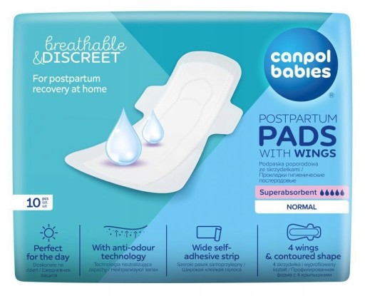 Canpol babies Podpaski poporodowe ze skrzydełkami na dzień to idealne rozwiązanie dla kobiet w czasie połogu, do użytkowania w domu po wyjściu ze szpitala. Podpaski są cieńsze i dyskretniejsze niż podkłady poporodowe, ale również bardzo chłonne i oddychające.