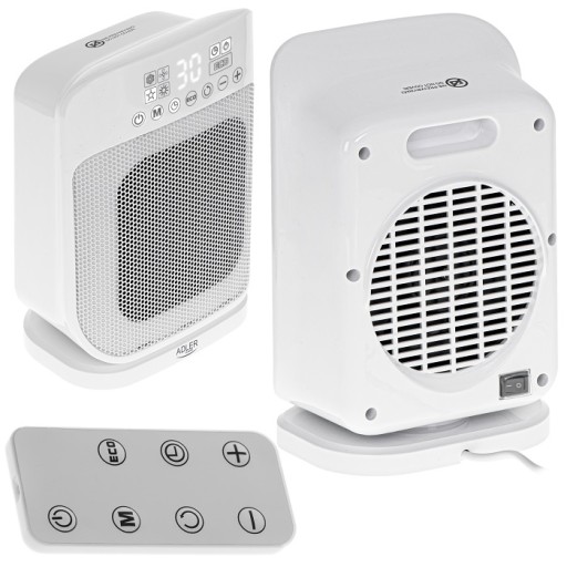 Termowentylator AD7727 marki ADLER - Biały - to niezawodne wielofunkcyjne urządzenie. Ceramiczny element grzejny w urządzeniu pozwala na regulację temperatury od 10 do 35°C. Może działać na dwóch poziomach mocy oraz posiada wbudowany elektroniczny termostat, dzięki czemu pozwala na regulację ilości wytwarzanego ciepła w zależności od potrzeb użytkownika. Może być również uruchomiony jako urządzenie chłodzące, wytwarzające zimny nadmuch. Z tego względu termowentylator ma swoje zastosowanie zarówno w czasie chłodnych jak i gorących dni. Dla zwiększenia bezpieczeństwa, urządzenie wyposażono w zabezpieczenie przed przegrzaniem oraz ochronę przed przewróceniem. Funkcję ECO optymalizuje poziom zużycia energii podczas grzania, aby utrzymać stabilną temperaturę w danym pomieszczeniu. Urządzenie jest wyposażone w timer 1-24 godziny, który odlicza czas do wyłączenia. Uchwyt do przenoszenia, oscylacja 45° i powierzchnia grzewcza do 15 m² sprawiają, że jest to produkt idealny dla każdego mieszkania i domu. Dla wygody urządzenie wyposażone w pilota zdalnego sterowania oraz czytelny wyświetlacz LED pozwalający na szybkie dostosowanie pracy urządzenia do naszych oczekiwań. Grzejnik ma też funkcję zapobiegającą zamarzaniu przy 7°C. Poziom hałasu podczas jego pracy określany jest na około 51 dB.