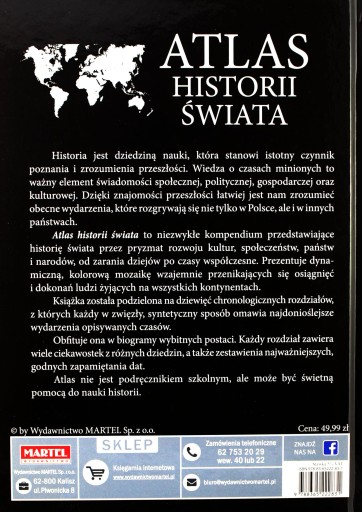 Historia jest dziedziną nauki, która stanowi istotny czynnikpoznania i zrozumienia przeszłości. Wiedza o czasach minionych to ważny element świadomości społecznej, politycznej, gospodarczej oraz kulturowej. Dzięki znajomości przeszłości łatwiej jest nam zrozumieć obecne wydarzenia, które rozgrywają się nie tylko w Polsce, ale i w innychpaństwach. Atlas historii świata to niezwykłe kompendium przedstawiające historie świata przez pryzmat rozwoju kultur, społeczeństw, państw i narodów, od zarania dziejów po czasy współczesne. Prezentuje dynamiczną, kolorowa mozaikę wzajemnie przenikających się osiągnięć i dokonań ludzi żyjących na wszystkich kontynentach. Książka została podzielona na dziewięć chronologicznych rozdziałów, z których każdy w zwięzły, syntetyczny sposób omawia najdonioślejsze wydarzenia opisywanych czasów. Obfituje ona w biogramy wybitnych postaci. Każdy rozdział zawiera wiele ciekawostek z różnych dziedzin, a także zestawienia najważniejszych, godnych zapamiętania dat. Atlas nie jest podręcznikiem szkolnym, ale może być świetnąpomocą do nauki historii.