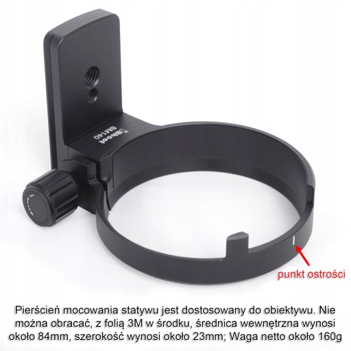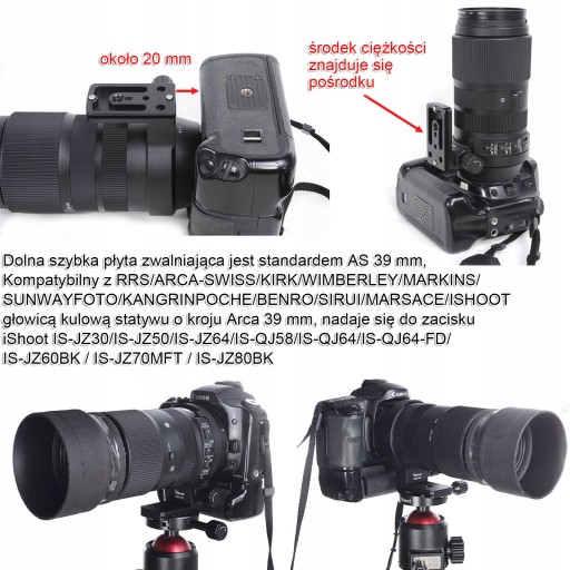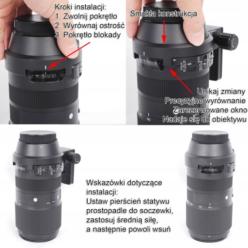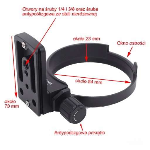 iShoot Metalowy pierścień montażowy do statywu IS-SM140 dla obiektywów Sigma 100-400mm f/5-6.3 DG OS HSM Contemporary (Canon EF Mount, Ny F Mount) Nie dla obiektywów Sigma 100-400mm f/5-6.3 DG DN OS (Ny E Mount, L Mount) Funkcja ARCA Fit Quick Release Plate na dole, kompatybilna z RRS / KIRK. Główne cechy głowicy kulowej statywu ARCA-SWISS / KIRK: 1. pierścień montażowy statywu wykonany z aluminium lotniczego, precyzyjna obróbka CNC, wydrążona konstrukcja zmniejszająca wagę, polerowana i anodowana powierzchniowo, ze śrubami ze stali nierdzewnej; 2. pierścień montażowy statywu dostosowuje się do obiektywu. Pierścień montażowy statywu nie jest obrotowy, wewnątrz znajduje się folia samoprzylepna 3M, średnica wewnętrzna około 84 mm, szerokość około 23 mm, płytka szybkiego zwalniania 70 mm na dole, otwory na śruby 1/4 i 3/8, ze śrubami antypoślizgowymi ze stali nierdzewnej; waga netto tego pierścienia montażowego statywu wynosi około 160 g; 3. Dolna płytka szybkiego zwalniania to standard AS 39 mm, odpowiedni dla RRS / ARCA-SWISS / KIRK / WIMBERLEY / MARKINS / SUNWINS / SUNWINS / SUNWINS / SUNWINS / SUNWINS / SUNWINS / SUNWINS / SUNWINS. MARKINS / SUNWAYFOTO / KANGRINPOCHE / BENRO / SIRUI / MARSACE / ISHOOT Głowica tnąca Arca 39 mm do zacisków iShoot IS-JZ30 / IS-JZ50 / IS-JZ64 / IS-QJ58 / IS-QJ64 / IS-QJ64 / IS-JJ64-FD / IS-JJ64-FD IS-JZ30 / IS-JZ50 / IS-JZ64 / IS-QJ58 / IS-QJ64 / IS-QJ64 / IS-JJ64-FD / IS-JZ60BK / IS-JZ70MFT / IS-JZ80BK do nowoczesnego obiektywu Sigma 100-400mm f/5-6.3 DG OS HSM (mocowanie NIKON EF, mocowanie KON F) UWAGA: Nie jest kompatybilny z obiektywem Sigma 100-400mm f/5-6.3 DG DN OS (mocowanie NIKON E, mocowanie L), należy wybrać numer modelu. IS-SM105ART dla tego obiektywu z mocowaniem E/L. Opakowanie zawiera 1 x iShoot Tripod Mount Ring IS-SM140 dla Sigma 100-400mm f/5-6.3 DG OS HSM Contemporary (Uwaga: Inne elementy niewymienione na zdjęciu służą wyłącznie jako odniesienie i nie wchodzą w skład zestawu).