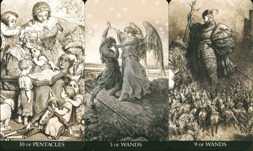 Gustave Doré ilustruje w czerni i bieli to, co jest duchowym krajobrazem. Tarot stał się gobelinem, który łączy Niebo z Ziemią, ponieważ każda ilustracja staje się symbolem mogącym rezonować z naszymi własnymi pytaniami i życiem. Talia zawiera 78 oryginalnych rycin Gustave Doré, wypełnionych dramatyczną i mistyczną energią, a teraz idealnie dopasowanych do archetypów Tarota.