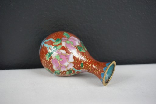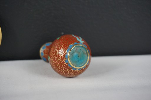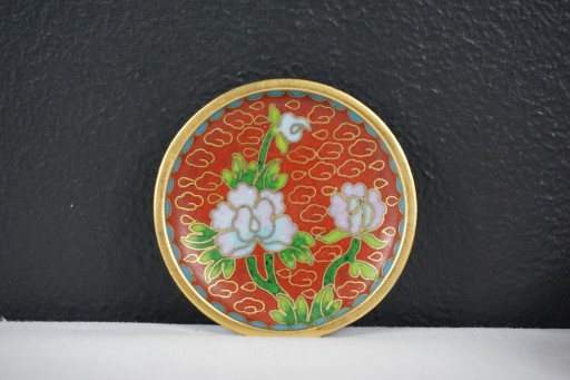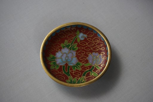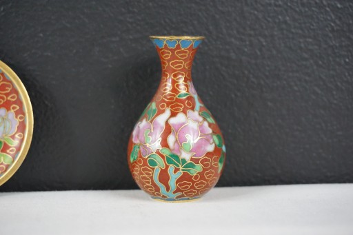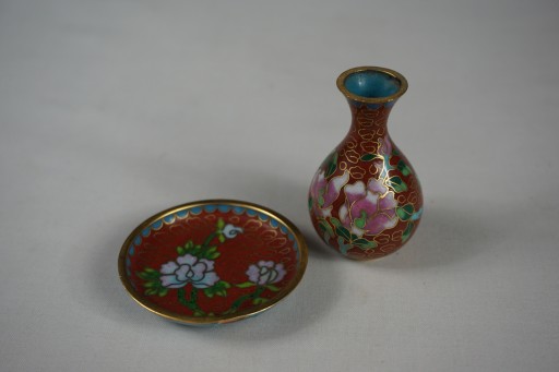 Zestaw dwóch małych przedmiotów zdobionych emalią komórkową. Wazonik wysokości 6cm, talerzyk średnicy 5.5cm. Stan ukazany na foto.