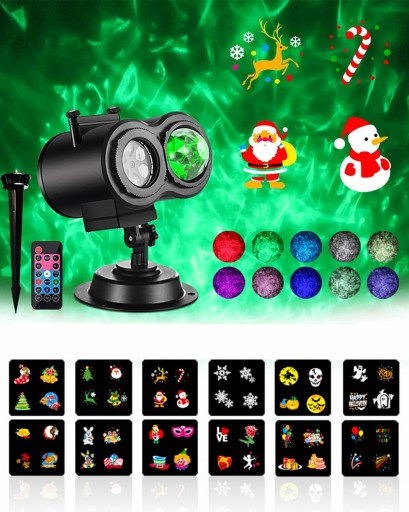 To najnowsza aktualizacja lamp projekcyjnych do dekoracji świątecznych 2023, z dwiema głowicami projekcyjnymi, jedną do efektu falowania wody RGBW, a drugą do obrazowania gobo. 10 opcjonalnych zmarszczek wody i 12 zjeżdżalni (72 klasyczne elementy) wyświetla światła i animacje, idealne na Halloween, Boże Narodzenie i inne świąteczne sceny o różnej tematyce.