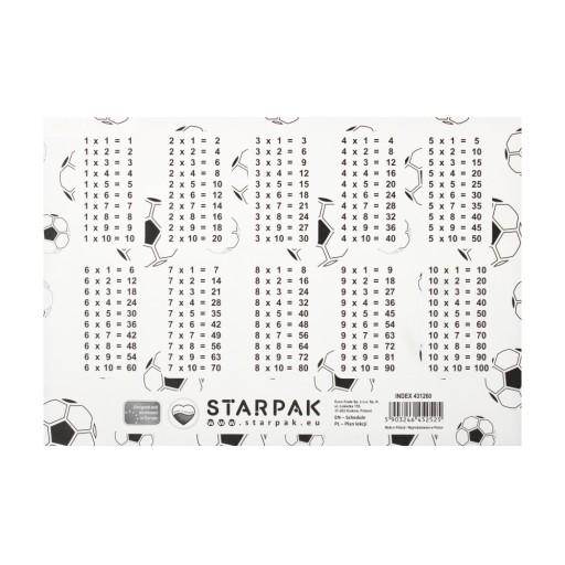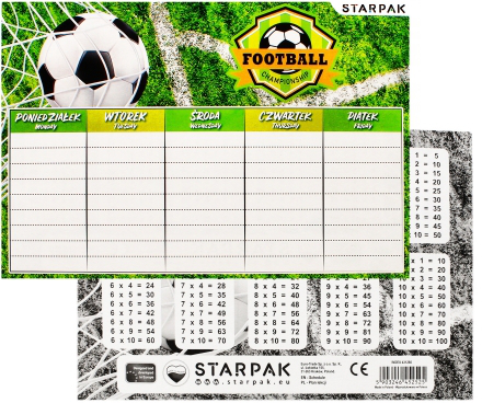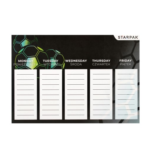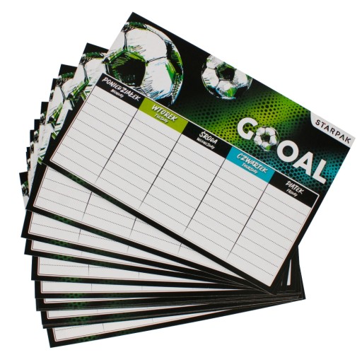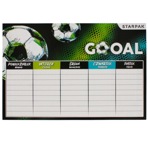 Plan z kolekcji Starpak z grafiką nawiązującą do piłki nożnej zawiera podział na pięć dni tygodnia z 8 wierszami do wpisu, dzięki czemu żaden uczeń nie zapomni o potrzebnych mu danego dnia książkach czy zeszytach. Grafika z piłką nożną sprawi, że każdy dzień w szkole będzie dobrze zaplanowany i udany.