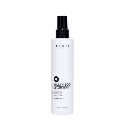 Spray Alter Ego Hasty Too Volume służy do stylizacji włosów cienkich, słabych i zniszczonych, zarówno naturalnych, jak i po zabiegach chemicznych. Odbija płaskie pasma od nasady i znacznie zwiększa objętość włosów na całej długości. Po zastosowaniu Alter Ego Hasty Too Volume pasma są gładkie, miękkie i lśniące.