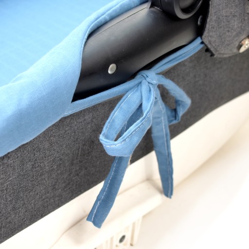 - Posiada ściągacz wykonany ze sznureczka w kolorze wkładki dzięki któremu można dopasować ją do każdej gondoli.
