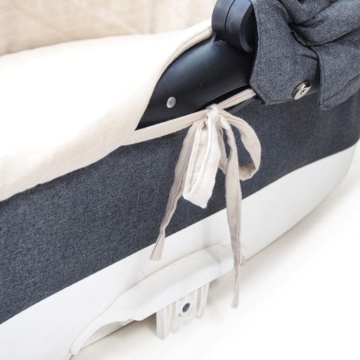 - Posiada ściągacz wykonany ze sznureczka w kolorze wkładki dzięki któremu można dopasować ją do każdej gondoli.